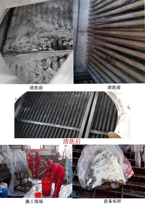 復(fù)合型蒸發(fā)式冷卻器上部是風(fēng)冷式,下部為水冷式。因此上部翅片管束表面由于接觸環(huán)境大氣、易于積存油膩、塵垢、煙垢、柳絮等附著物,形成較大的熱阻,污垢的存在將大大降低甚至喪失鋁翅片冷換設(shè)備的冷卻作用。另外鋁翅片表面的污垢也會促使垢下腐蝕。下部水冷式光管表面由于外部環(huán)境條件影響,并且由蒸發(fā)式空冷器的特點(diǎn),造成循環(huán)冷卻水濃縮快,濃縮倍率高,硬度,堿度高,濁度高等困難。在長期運(yùn)行過程中,空冷器光管束表面生成了很厚的硬垢,嚴(yán)重影響了空冷器換熱效果,增加了能耗,影響了正常生產(chǎn)和安全。為了保證設(shè)備安全,穩(wěn)定運(yùn)行,延長使用壽命,提高冷卻效率,應(yīng)對其進(jìn)行定期清洗。